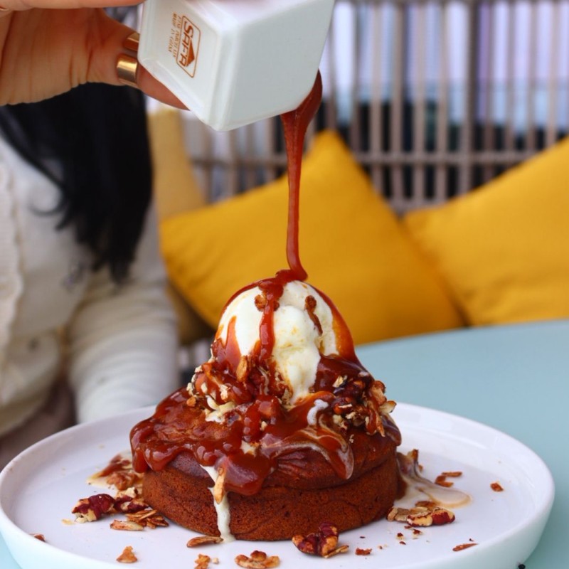 بانكيك طري ودافئ يُقدَّم مع صوص كراميل غني ونكهة فاخرة تذوب في كل لقمة.