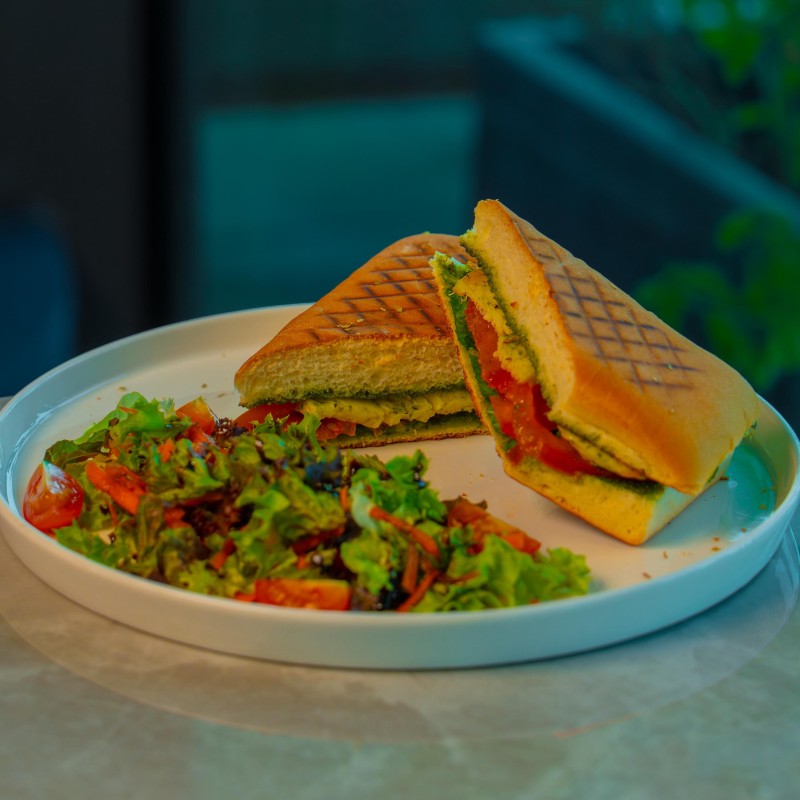 حلوم مشوي، بيستو ريحان، جرجير، وطماطم مجففة داخل خبز تشاباتا دافئ.