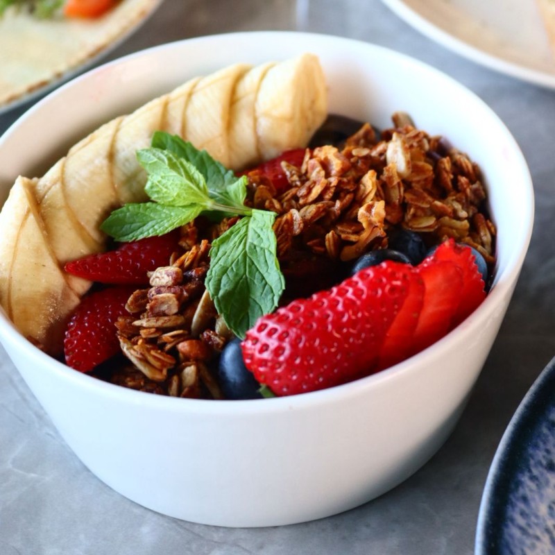 جرانولا مقرمشة مع زبادي يوناني وفواكه طازجة.