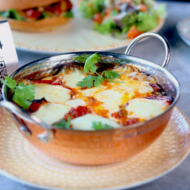 طماطم وفلفل مطهوّة بزيت الزيتون ومغطاة بجبنة الموزاريلا الذائبة.
